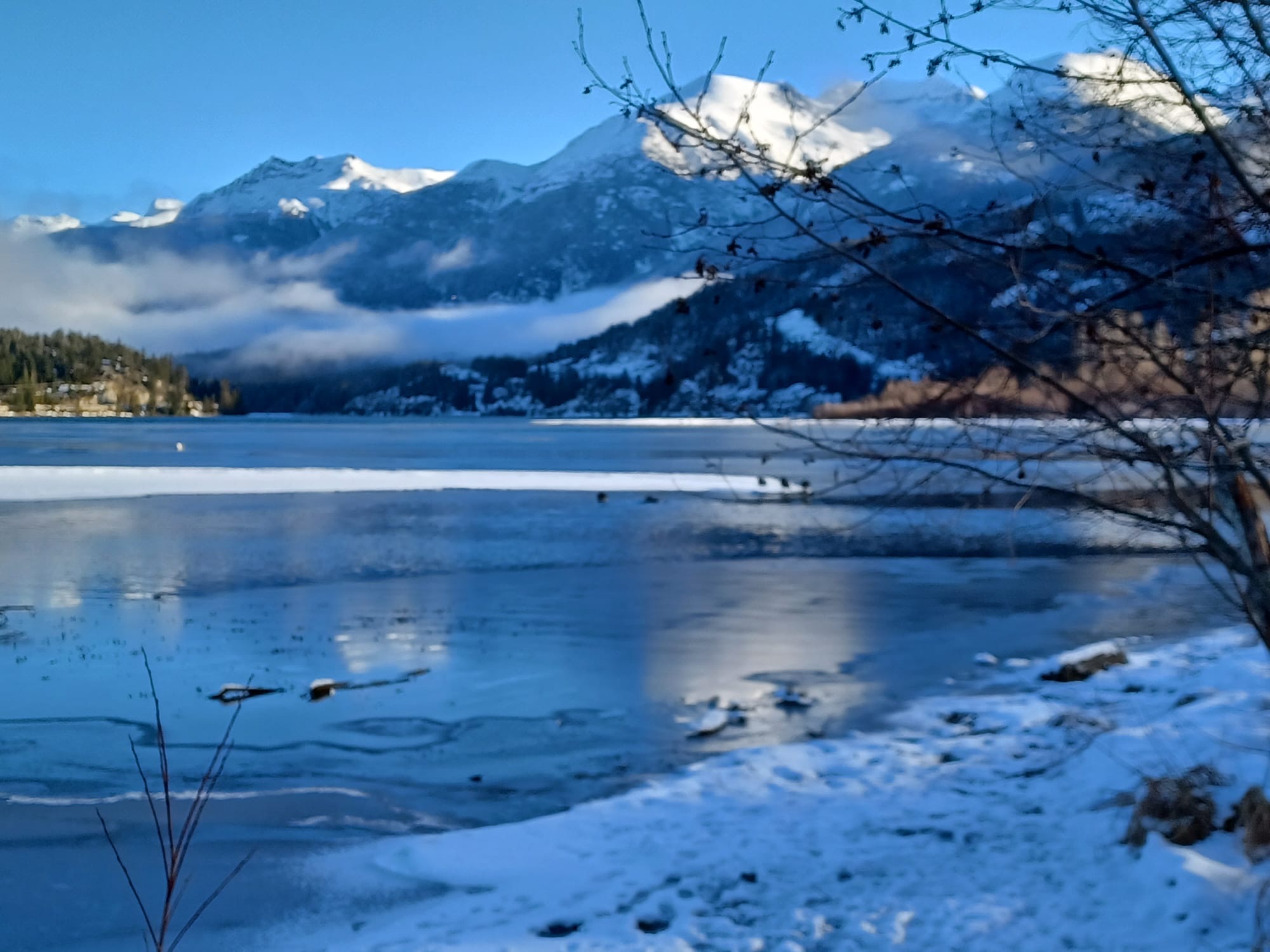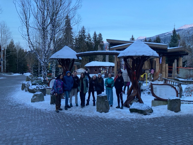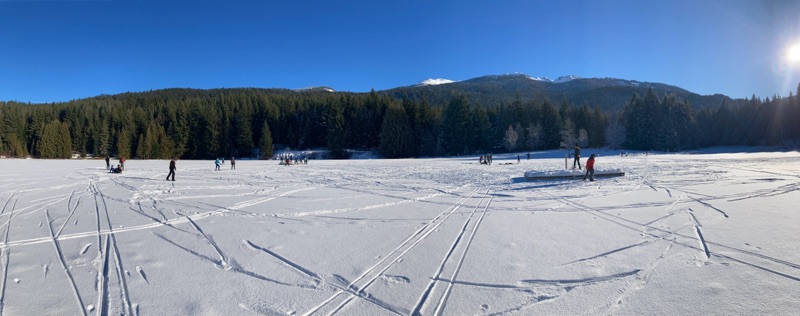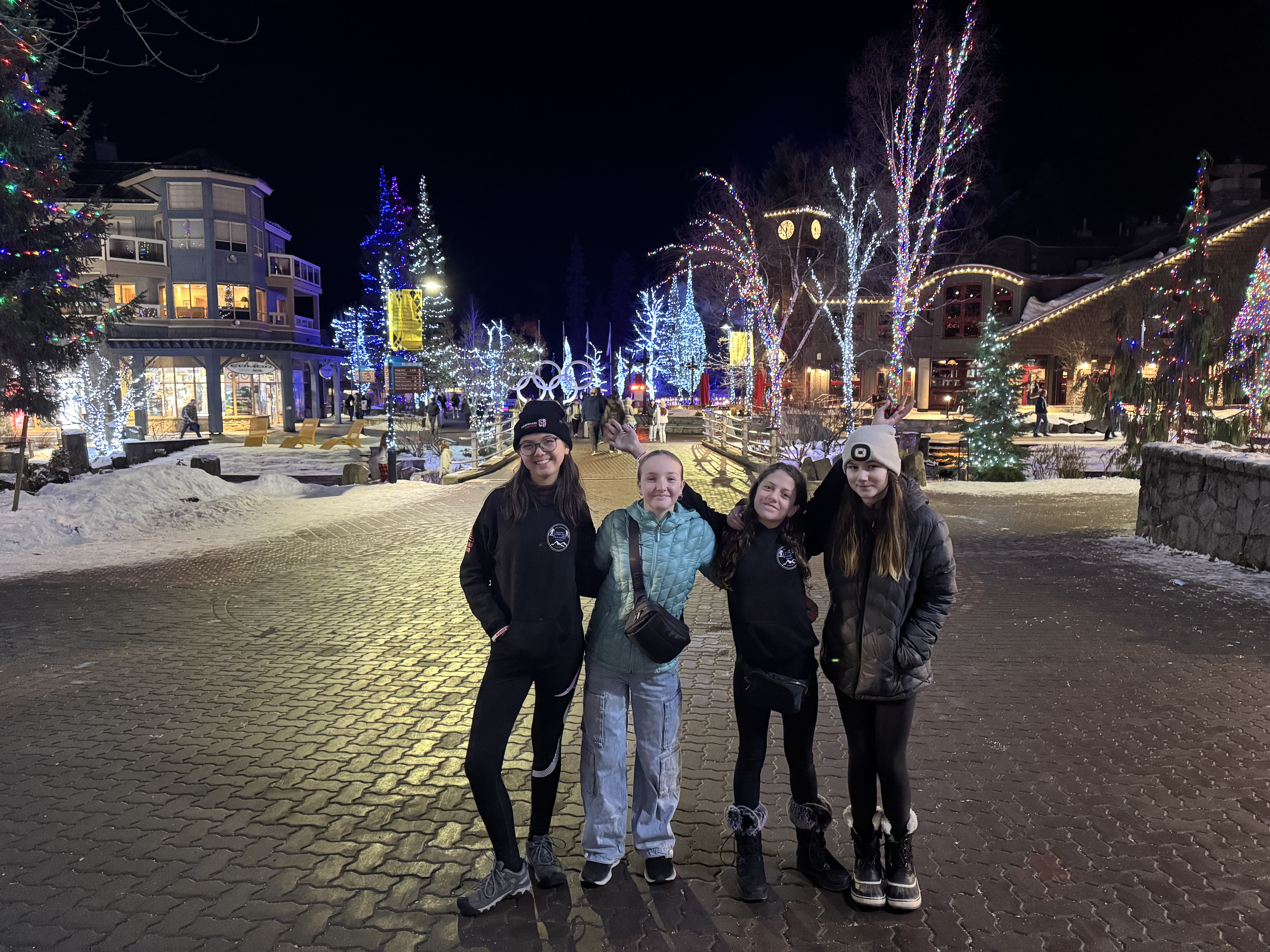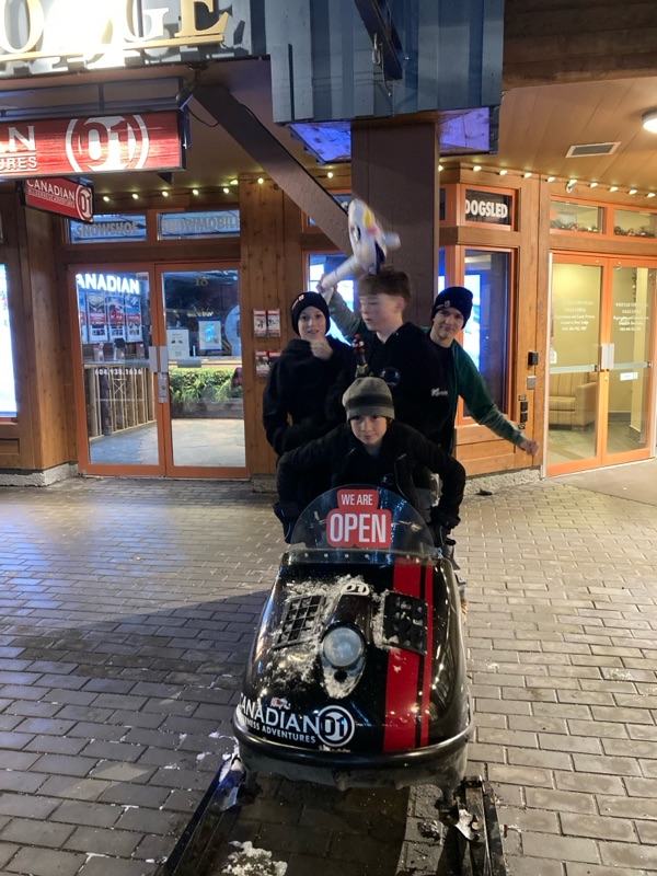 At the warming hut, we took a break for lunch and hot chocolate. We then had some fun playing a game of tag on the frozen lake. Refreshed, we returned to Meadow Park for a swim at the public pool, where there was a lively mix of cold water enthusiasts and hot tub fans. A well-timed snack gave us a boost before we dressed up to head to Whistler Village.