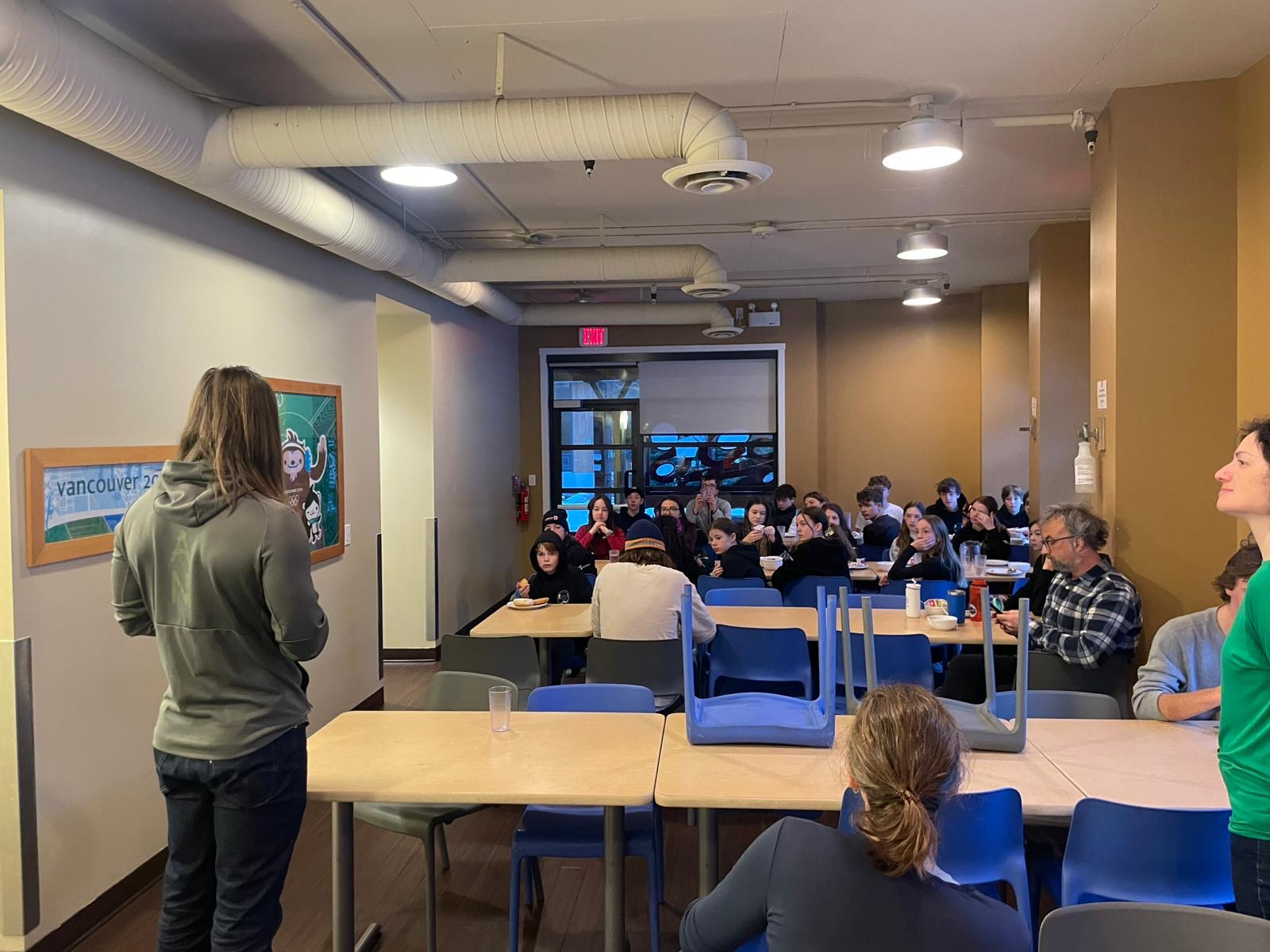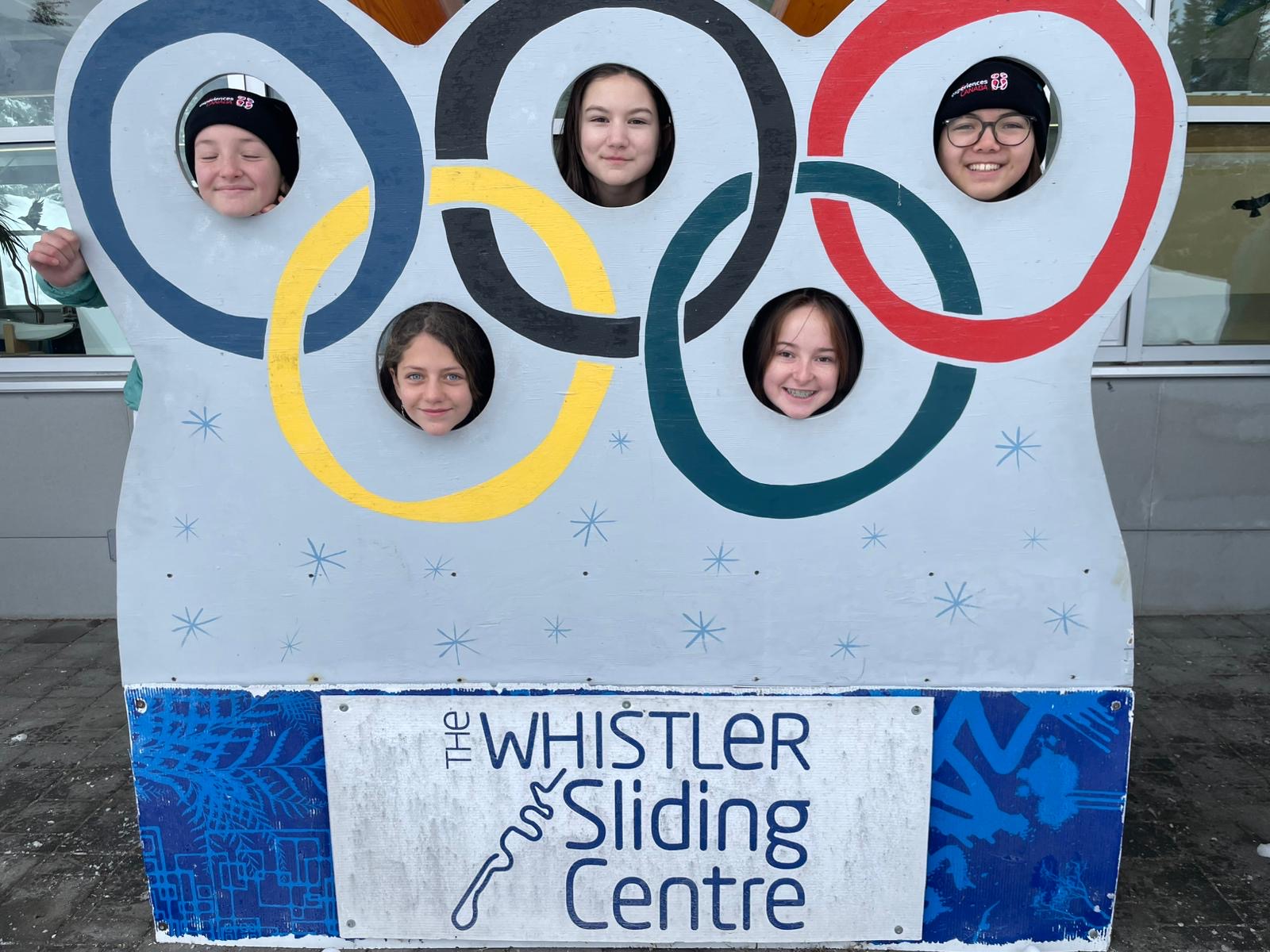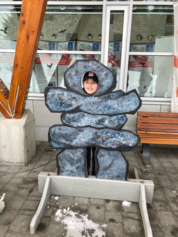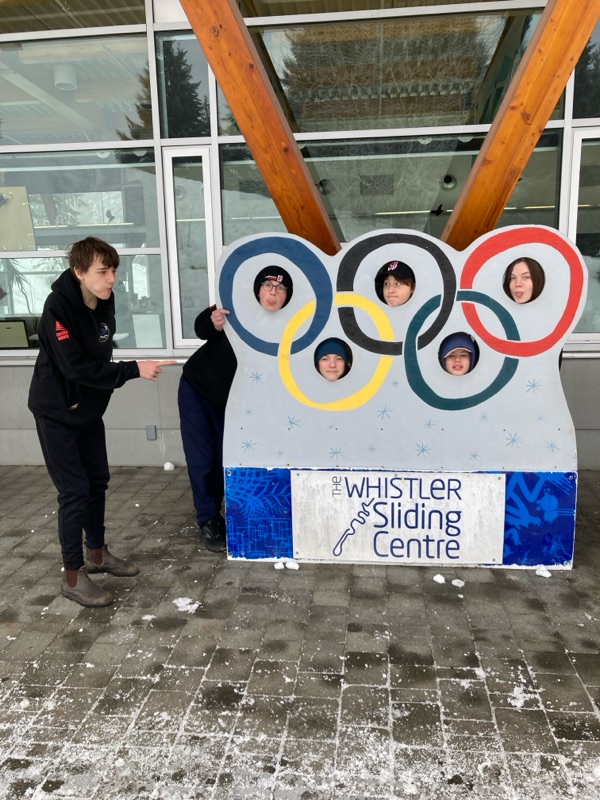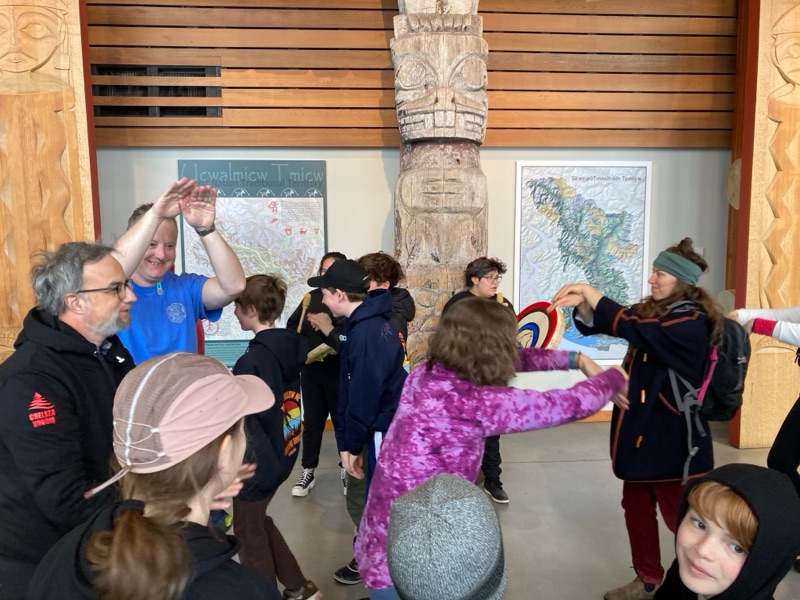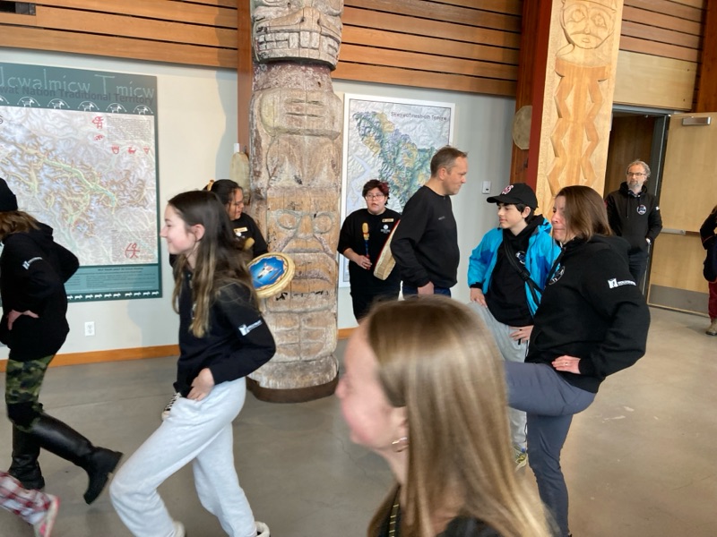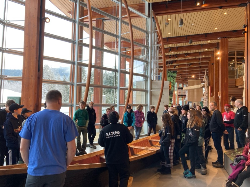 Next, we had some fun fitting all our luggage and people into the vehicles, which turned into a real-life game of Tetris! Once packed, we made our way to the SLCC museum, still buzzing with the knowledge from Tristan’s talk about the differences between luge, skeleton, and bobsleigh. We enjoyed a brief stop at the Slinging Center before arriving at the SLCC museum in Whistler, where we were warmly greeted and even sang a welcoming song. During the song, the group was divided into teams representing orca, wolf, and raven, which added an extra layer of excitement to our visit. A standout moment was discovering that the large canoe on display had once made its way all the way to Hawaii!