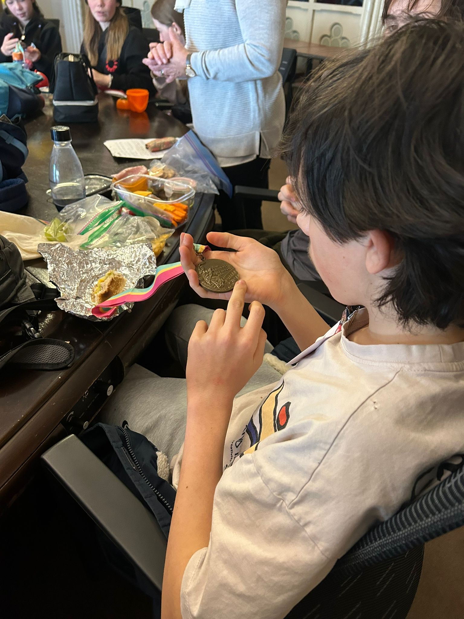 After this fascinating visit, we enjoyed a lunch in a unique room of the East Block, where our host, Sue Holloway, shared her inspiring career as a trailblazing Olympian. Sue made history as the first female athlete to compete in both the Winter and Summer Olympics. In 1976, she participated in cross-country skiing at the Winter Olympics and later competed in kayak at the Summer Olympics in the same year—an incredible achievement that made her a true pioneer in the world of sports. At 22, she decided to focus her efforts on one sport, which led her to win two medals in the 1984 Los Angeles Olympics. Her advice to our athletes was to always say yes to opportunities (except for drugs), which had everyone laughing—especially when Sam jokingly asked if that meant jumping off a cliff! Sue also shared her experience on a survival of the Fittest TV show, adding another thrilling chapter to her story. She had her 2 medals and the kids had a chance to look at them.